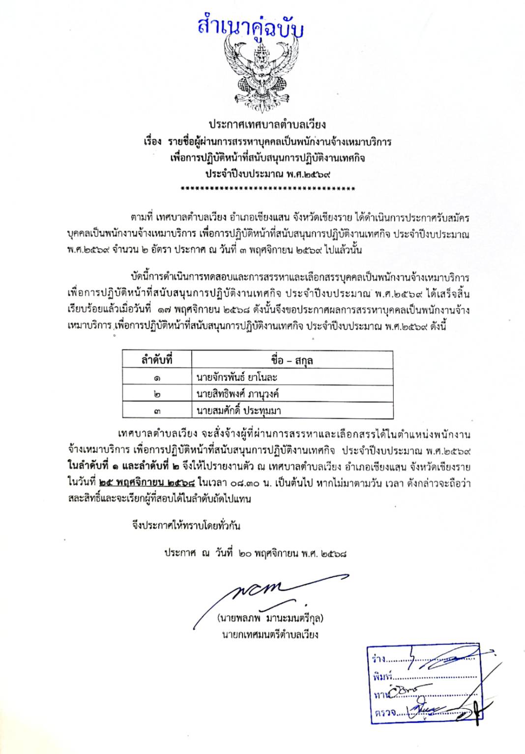 ประกาศเทศบาลตำบลเวียง เรื่อง รายชื่อผู้ผ่านการสรรหาบุคคลเป็นพนักงานจ้างเหมาบริการ เพื่อการปฏิบัติหน้าที่สนับสนุนการปฏิบัติงานเทศกิจ ประจำปีงบประมาณ พ.ศ.๒๕๖๙
