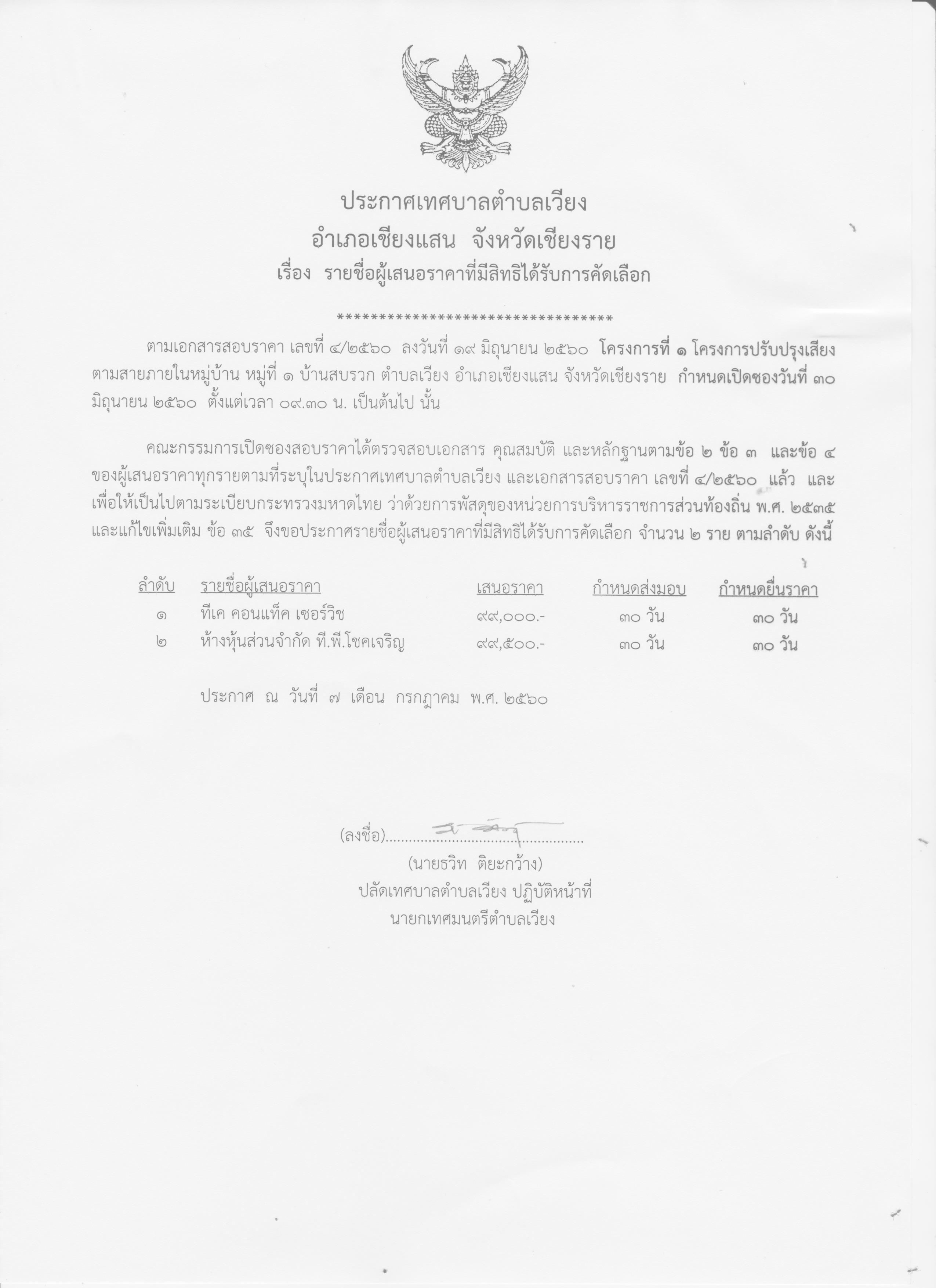 ประกาศเทศบาลตำบลเวียง เรื่อง ผลการสอบราคา โครงการ ปรับปรุงเสียงตามสาย ประจำหมู่บ้าน หมู่ที่ 1 บ้านสบรวก ตำบลเวียง อำเภอเชียงแสน จังหวัดเชียงราย