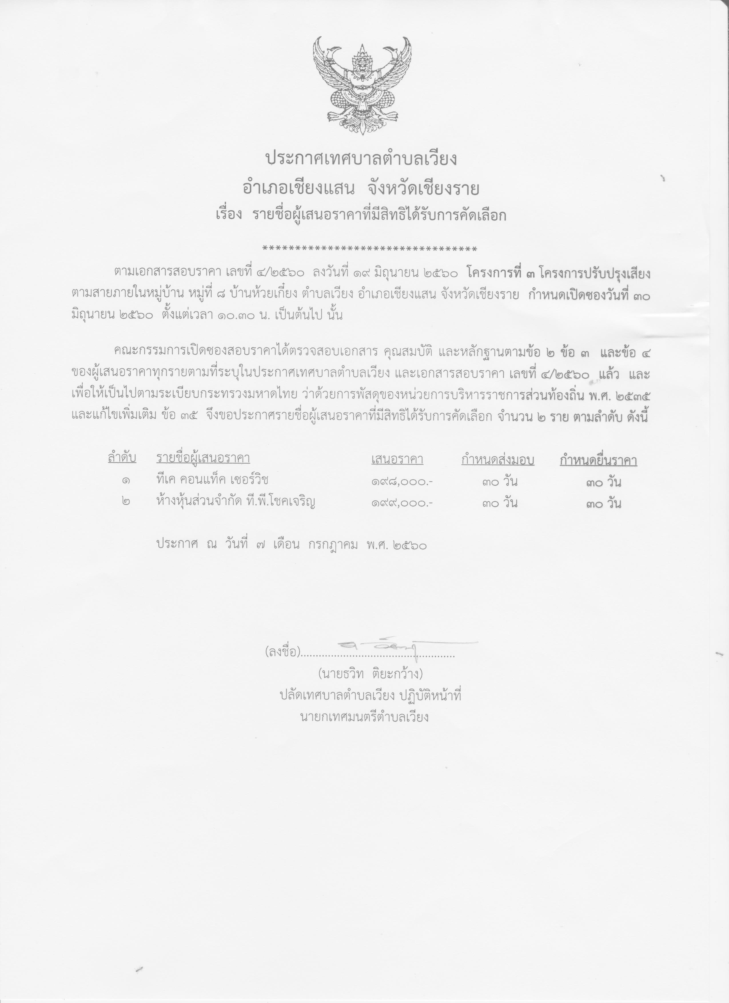 ประกาศเทศบาลตำบลเวียง เรื่องผลการสอบราคา โครงการปรับปรุงเสียงตามสาย หมู่ที่ 8 บ้านห้วยเก๊่ยง ตำบลเวียง อำเภอเชียงแสน จังหวัดเชียงราย